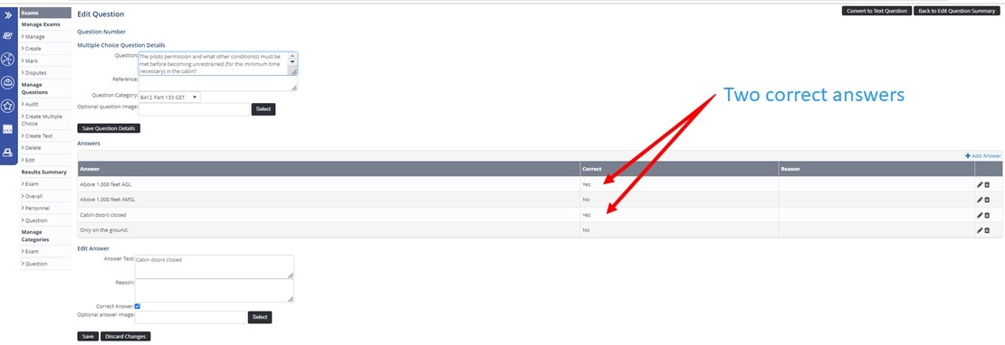 When compiling a multi-choice exam there are check boxes to flag each choice if correct. This allows the participant to select more than one correct answer when undertaking the exam. This option does not flow onto the exam as the program only allows the participant to select one answer.
