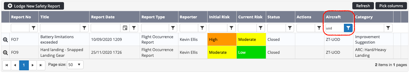 1. enters a value into the filter/search field of the AIRCRAFT column in the Safety Report Register (see attached screenshot),