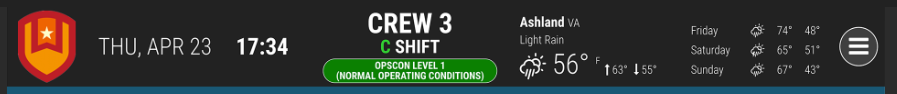 Add the ability for users to enable a 24-hour clock (military time) in the CAD status/task bar, ideally in the upper-right corner. Also include an optional setting to display the current date and local weather conditions based on the user's location or assigned base.